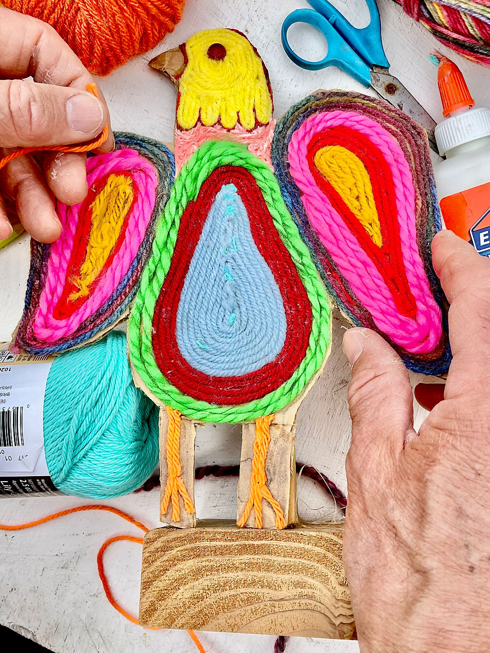 I learned how to create yarn paintings after being given a gift that was made by a Wixàrika artist. The Wixàrika people of Mexico create brightly colored images utilizing a unique method. The artist puts yarn onto a wood panel and it is held in place by beeswax. The subject matter of a Wixàrika yarn painting involves images that relate to the Wixàrika peoples’ religion. I found the look and texture of the yarn on the wood surface enthralling, and so I started to make my own yarn paintings with my own subject matter. And instead of getting the yarn to stick to the wood with beeswax, I use ordinary white glue that is available even at the super market. I’ve learned a few useful techniques that help in the making of yarn painting and I’ll show everybody what I know at my demonstration!